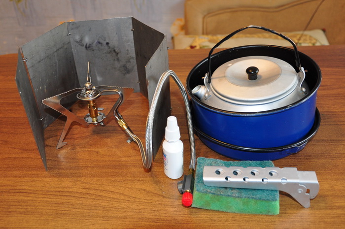 На двоих беру шланговую горелку с ветрозащитой, кастрюльку 1,5 л с чайником 0,9 л (все вместе 1 кг). Поскольку дихлофосные баллоны в 2 раза дешевле аналогичных резьбовых, использую их через переходник.